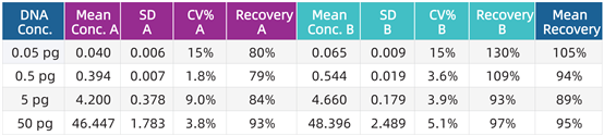 準確性與可重復性測試。由兩名操作員(A和B)分別在兩天內對已知DNA樣本進(jìn)行兩次檢測,計算檢測結果的SD, CV和回收率%(見(jiàn)下表)。