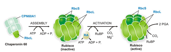 CO2的固定是利用光反應產(chǎn)生的ATP和NADPH合成有機物的過(guò)程,該過(guò)程稱(chēng)為卡爾文循環(huán)。1,5二磷酸核酮糖羧化/加氧酶(Rubisco)是CO2固定過(guò)程中的關(guān)鍵限速酶,催化CO2和RuBP(核酮糖-1,5-二磷酸)發(fā)生羧化、然后裂解形成兩個(gè)PGA(甘油酸-3-磷酸)分子。所有光合生物都具有由8個(gè)大亞基RbcL和8個(gè)小亞基Rbcs組成的I型Rubisco,且RbcL折疊到其天然狀態(tài)依賴(lài)于葉綠體定位的分子伴侶CPN60的作用。