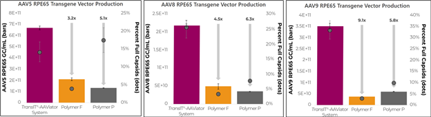 使用不同的質(zhì)粒設計(GFP基因-圖3;RPE65 基因-圖4),平行比較TransIT®-AAViator 轉染系統與“Poly F”(Polyplus FectoVIR® 病毒轉染試劑)以及“Poly P” (Polyplus PEIpro®病毒轉染試劑)。實(shí)驗結果顯示,在不同AAV血清型別中 (AAV5、8、9),TransIT®-AAViator 轉染系統有著(zhù)更高的病毒滴度及實(shí)心率,當質(zhì)粒設設計替換成治療性基因(RPE65 基因),病毒滴度及實(shí)心率相比于競爭品牌,其優(yōu)勢更加顯著(zhù)。