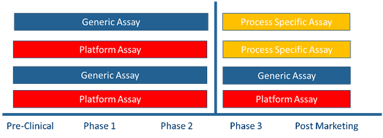 USP<1132>提到在沒(méi)有平臺化方法的情況下可以在臨床前、臨床I期、II期使用商品化試劑盒;在臨床III期/工藝驗證及產(chǎn)品上市后,由于商業(yè)化的通用HCP檢測試劑盒抗體的覆蓋率往往不足等局限性,需要考慮結合細胞類(lèi)型及工藝特異性等因素,使用平臺化方法或針對上游工藝開(kāi)發(fā)的產(chǎn)品/工藝專(zhuān)屬性方法。
