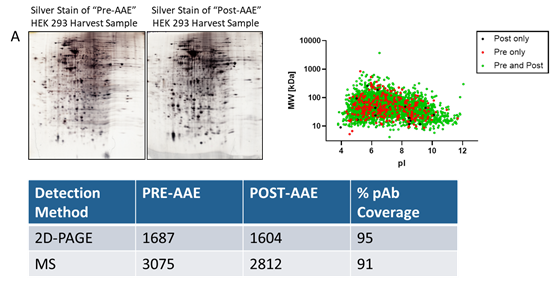AAE-MS?也可以對藥物原液中HCPs富集的同時(shí)去除了大部分原料藥。去除原料藥極大地提高了通過(guò)2D-PAGE和質(zhì)譜分析識別單個(gè)HCPs的能力,因為藥品通常以104-106的倍數掩蓋HCPs。AAE-MS?是一種更客觀(guān)和直接的方法檢測和鑒定原料藥中任何潛在的HCPs雜質(zhì)以幫助優(yōu)化下游純化工藝。