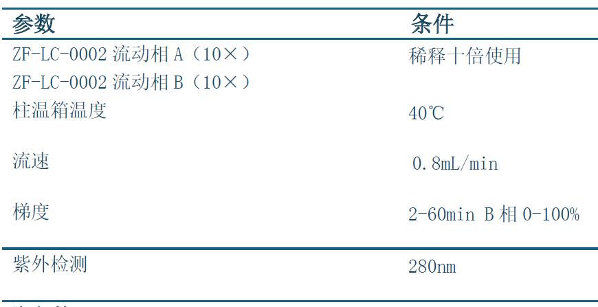 下表列出了使用ZF-LC-0002流動(dòng)相A&B(10×)進(jìn)行IEC-HPLC液相分析的色譜參數: