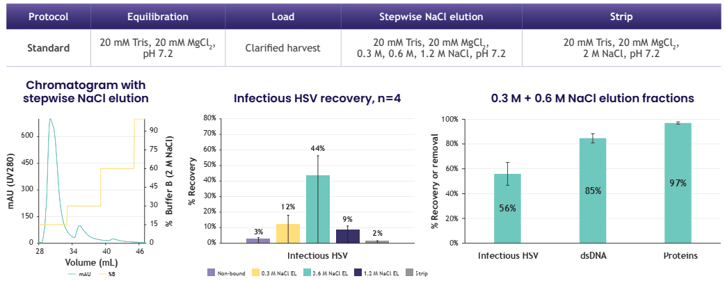 感染性HSV回收率為56%,LentiHERO®載量可達9.2E+9 IU/ml,大部分感染性HSV在0.6M NaCl條件下被洗脫。